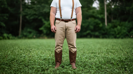 Model showcases cowboy suspenders, leather boots, and country style in outdoor setting.