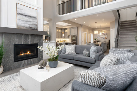 This living room features a fireplace, comfortable gray sofas, and a white coffee table. The interior showcases a modern design with neutral colors and soft textures. The space is well-lit, possibly suggesting an open floor plan. Suitable for lifestyle, home decor, or architectural content.