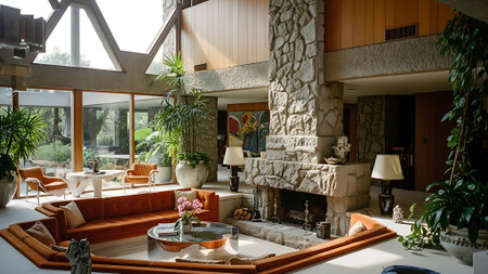A stylish mid-century modern living room featuring a cozy orange sectional sofa, green couches, and a large fireplace. The decor includes various ceramic vases, indoor plants, and warm lighting.