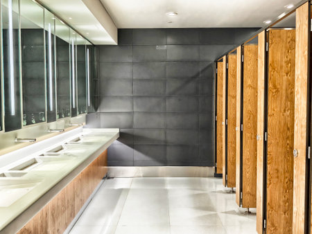 Spacious and modern restroom displays sleek sinks, wooden stalls, and ample lighting, creating a serene atmosphere for users.
