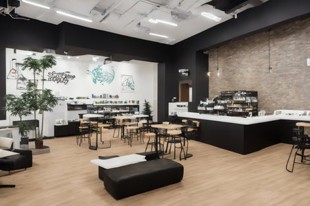 Interior of a cafe with black chairs and tables. 3d rendering