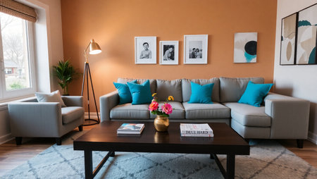 A stylish modern living room interior design with vivid and warm tone colors in the apartment. Generative AI AIG27.