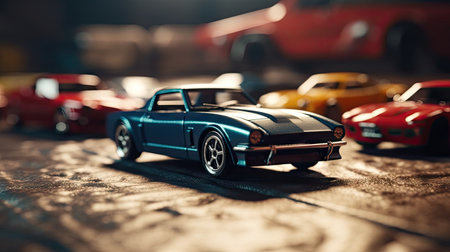 Brightly colored vintage toy cars neatly lined up, highlighting various classic designs and styles under warm lighting.