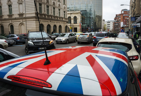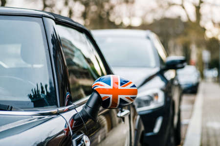 Paris, France - Jan 28, 2019: United Kingdom Union Jack flag on the rearview mirror of a Mini Cooper car - British symbolism