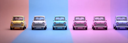 Six miniature cars of different colors sit side by side on a smooth pastel background, creating a cheerful display.