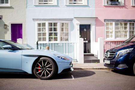 Sportive Blue Car Parked Outside Colorful Houses from London