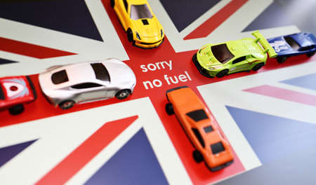 inscription sorry no fuel on the background of the British flag and a queue of cars. The fuel crisis in Great Britain.