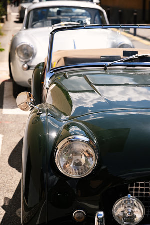 Sables d Olonne, France - September 23, 2016 : English vintage car rally in the streets of the city, A Nous les Belles Anglaise - Antique car in the Street
