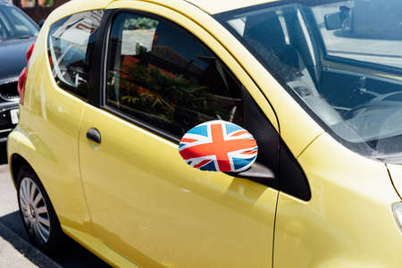 Union Jack flag on the private car side door mirror is coated with textil decor. Great Britain national flag colors. Festive Car Decor for Queen jubilee celebration. Patriotic concept.