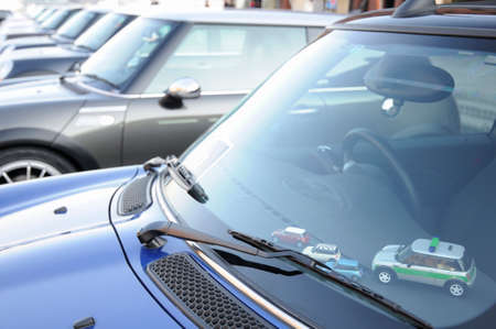 Colorful cars standing in line on parking cars, different colored cars of sideview