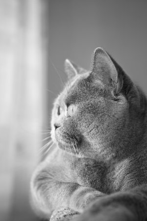 Beautiful gray Scottish domestic cat is resting in a light room, close-up on a blurred background. Copy space for an inscription.