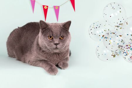 British gray cat and decoration on wall, balloons on light blue background. Birthday Cat Party