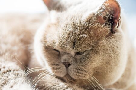 Beautiful British Shorthair cat is lying and sleeping on the window