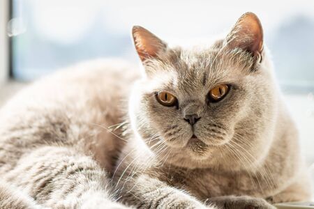British shorthair cat. A beautiful domestic cat is resting in a light blue room, a gray Shorthair cat with yellow eyes looking at the camera.