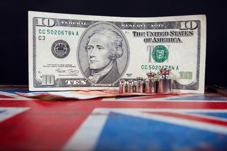 Flag of United Kingdom sticking in a variety of american banknotes.(series)