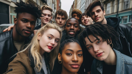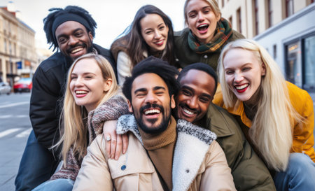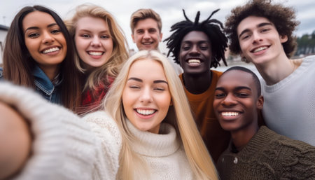 Global smiles: capturing joy in group selfies of cheerful and happy young people diverse nationalities, celebrating unity, friendship, cultural harmony in shared moments of happiness and togetherness