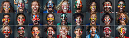 Multi National teams Fans with painted own country flags faces colors smiling laughing excited Roaring Supporting their favorite team straight at camera. Active sport fans movement and emotion collage