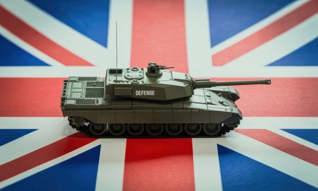 Dark green modern military tank model positioned centrally on a vibrant united kingdom flag, representing national defense, power, and security.