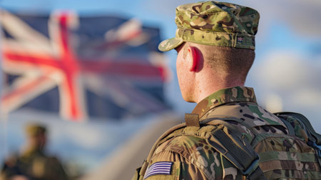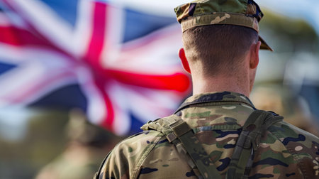 An image capturing a soldier in a camouflage uniform, prominently displaying a British flag patch, set against a natural backdrop. This scene emphasizes duty and pride in service, showcasing military readiness amid serene surroundings.
