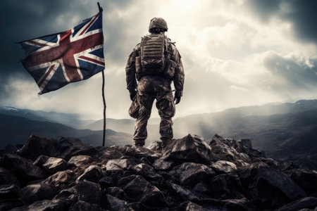 Soldier in military uniform on a mountain near a battlefield with a British flag