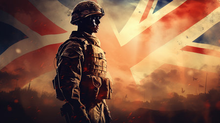 Silhouettes of a soldier with United Kingdom flag on background of sky. Background for Remembrance Day. United Kingdom Armed Forces concept. eps10 vector