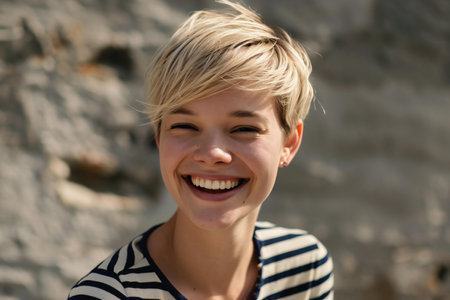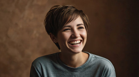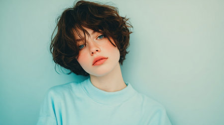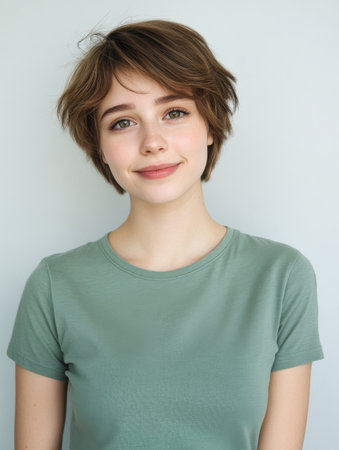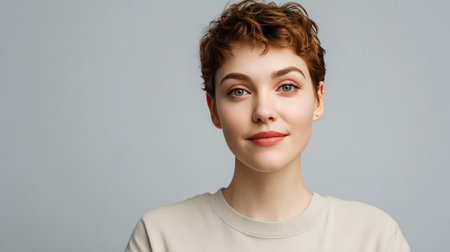 A portrait of a young woman with short hair and natural makeup, exuding confidence and approachable beauty against a simple background, perfect for personal or professional use.