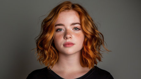 Young woman with wavy, shoulder length red hair and freckles gazes directly at camera, exuding confidence and charm. Her expression is calm and inviting, set against neutral background