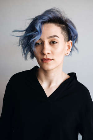 Portrait of a beautiful young woman with short blue hair and blue eyes