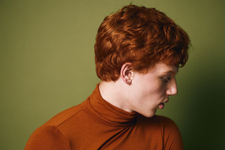 Young man with red curly hair wearing a brown turtleneck looking down against a plain olive background in studio lighting for portrait or fashion concept.
