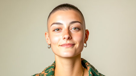 Young, confident model smiling with shaved head, embracing individuality and beauty