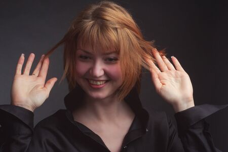 Studio portrait of a young funny woman with short hair in a black blouse, laughing, disheveled hair
