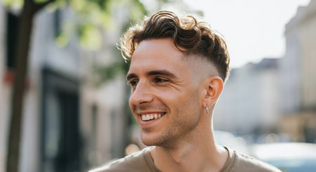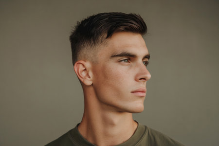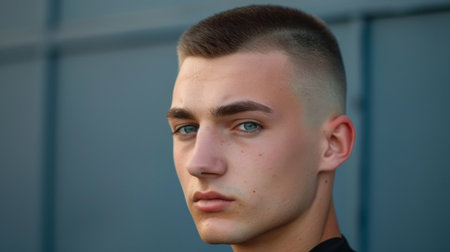 Close-up of a young man with a neatly groomed crew cut hairstyle, looking sharp and confident