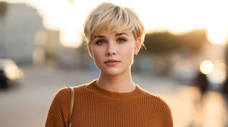 A beautiful young woman with short blonde hair captured outdoors during golden hour. The soft sunlight enhances her natural beauty, creating an inviting atmosphere.
