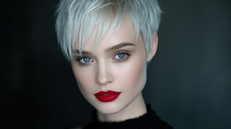 A high-quality image of a woman with a trendy pixie cut, showcasing a bold and edgy look with well-defined layers and a stylish finish.