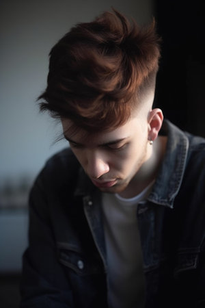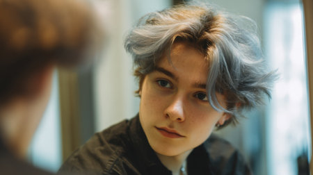 A captivating portrait capturing a young person with light blue hair gazing thoughtfully into a mirror, reflecting modern youth culture and personal style.