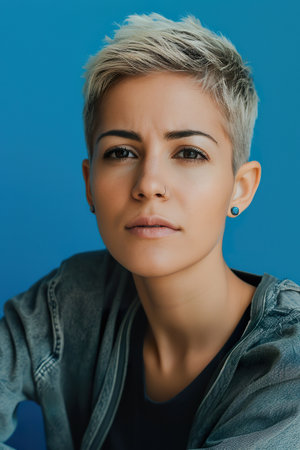 Confident Genderfluid Individual with Short Hair Against Blue Background.