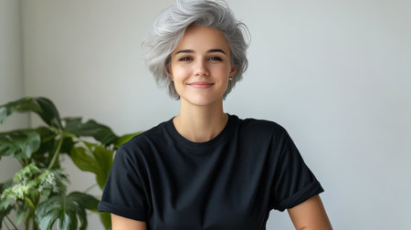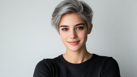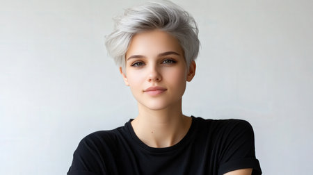 Close up of beautiful woman with white skin, grey short hair, wavy hair and a clear black t shirt, isolated in a light white studio. Portrait person.