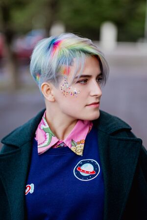 Portrait of a young beautiful woman with a short haircut and dyed hair. Grey main color and yellow, green, blue and red hair color. Posing in the street.