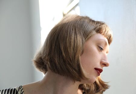 Close-up of a young woman with short hair and shadow play on her face, against a white background