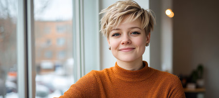 Confident woman with blonde pixie haircut at home, showcasing modern style and ready for online use.