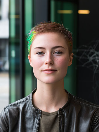 Portrait of a young beautiful woman in green coat with a short haircut and dyed hair. Grey main color and yellow, green, blue and red hair color. Posing in the street.