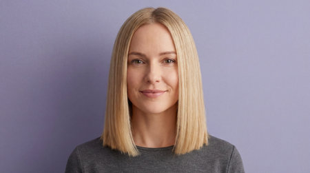 Confident young woman with straight blonde hair smiling calmly against pastel purple background in simple grey top.