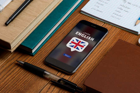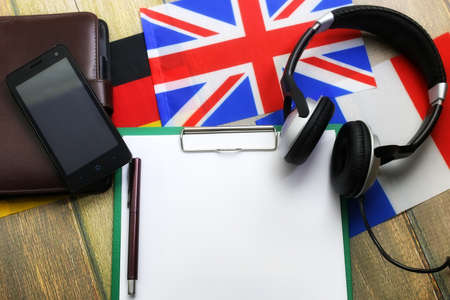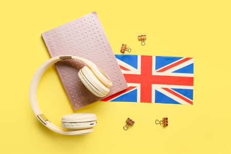 Notebook, headphones and UK flag on color background. Concept of learning English