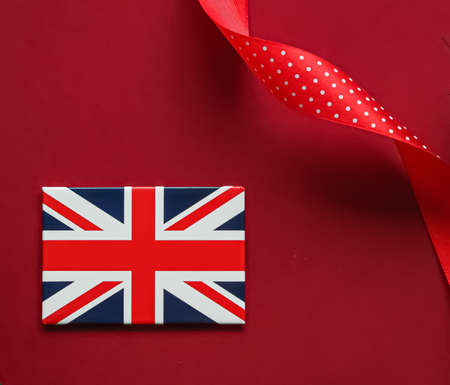 Union Jack flag of Great Britain on red background, Queen's Platinum Jubilee and holiday celebration concept