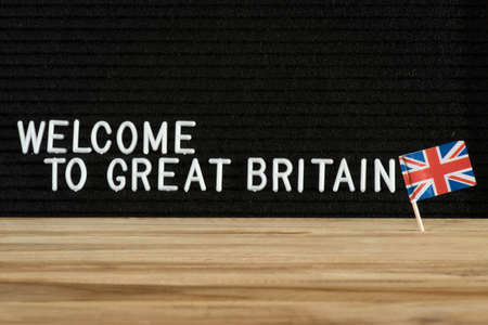LONDON. Urban Area in Great Britain. Flag and alphabet letters on wooden texture background
