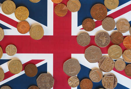 Pound coins money (GBP), currency of United Kingdom, over the Union Jack