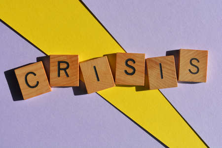 Crisis, word in wooden alphabet letters isolated on purple and yellow background