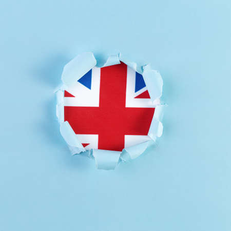Two flags of the United Kingdom made of recycled paper on the cardboard desk, flat layout