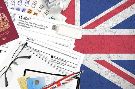 English form LLAD04 Change of location of the records to the registered office of a limited liability partnership LLP from Companies House service lies on table with office items. CH paperwork process
