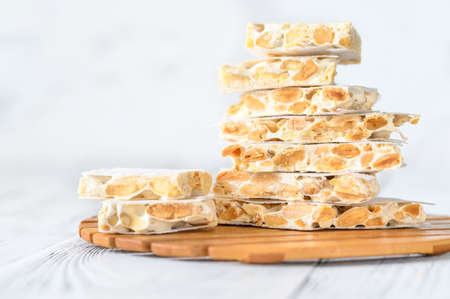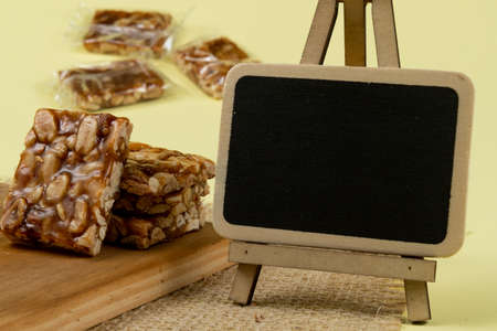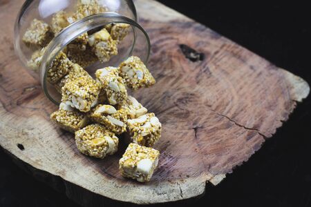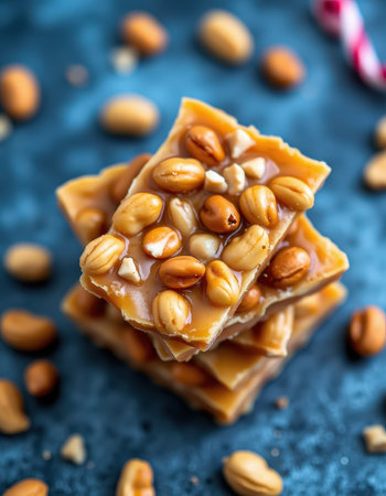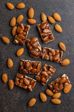 Peanut brittle, an old school sweet favorite, cut into small bars on rustic type surface with copy space